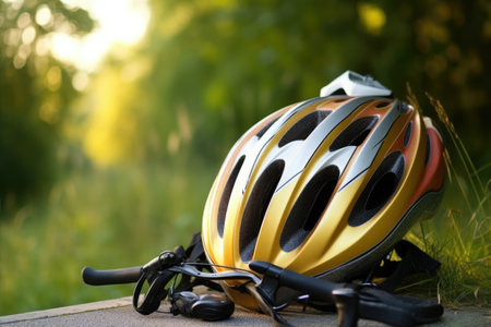 closeup of a colorful cycling helmet on an asphalt road, created with generative ai