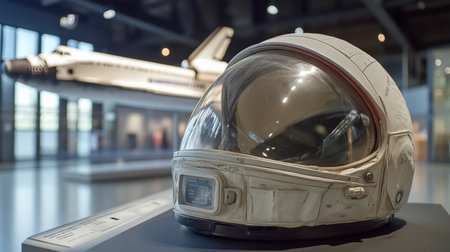 A vintage astronaut helmet prominently displayed in a museum, with a space shuttle model in the background, showcasing the essence of human space exploration.