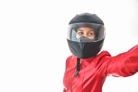 Close-up portrait of attractive biker woman wearing white helmet and shows safety conditions. Space for text.