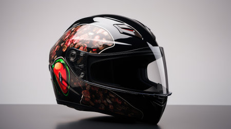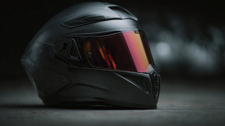 Close-up of a glossy motorcycle helmet on a matte black table with shallow depth of field
