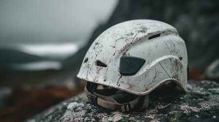 Worn climbing helmet with scratches, placed on a rocky surface near a cliff edge