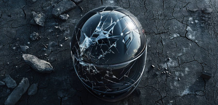 Cracked racing helmet lying on the ground, surrounded by debris and rough texture. Symbolizes danger and the aftermath of a crash in motorsport.
