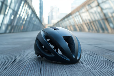 A sleek black helmet is placed on a wooden walkway in a contemporary urban area during early morning light.