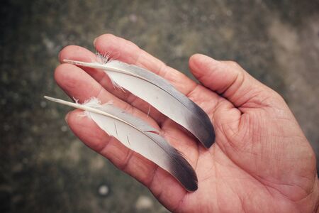 A row of fluffy tender pockmarked feathers and feather lies on a light gray modern background. The concept of lightness, airiness, tenderness, boho style. Greeting card with feather.