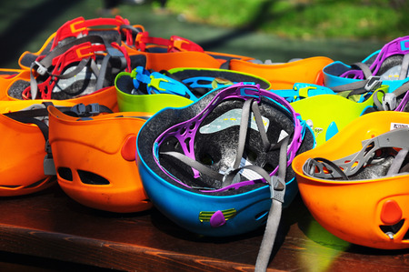 Helmets for rock climbers, arranged in rows outdoor