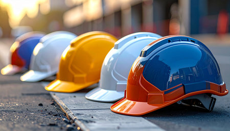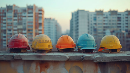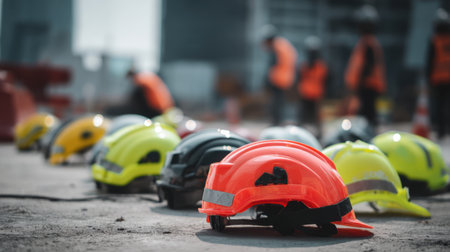 Vibrant safety helmets arranged on a construction site ground, with blurred silhouettes of workers in the background, highlighting the importance of safety and teamwork.