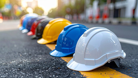 A line of safety hard hats in multiple colors are placed on an asphalt road with a distinct yellow line, blurred background.