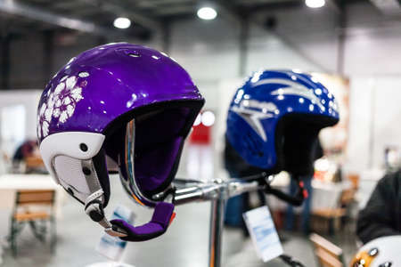 HELSINKI, FINLAND - NOVEMBER 15, 2019: Ski shop sale. Rows colourful winter sport helmets in sport equipment store