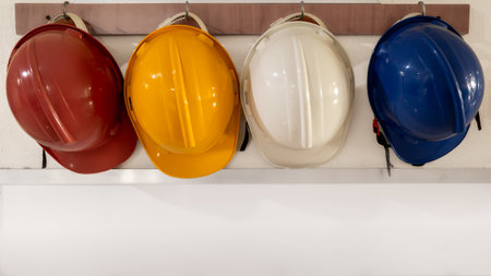 Safety helmets differentiated by color red, yellow, white and blue being hang at hospital wall