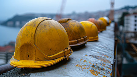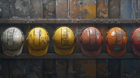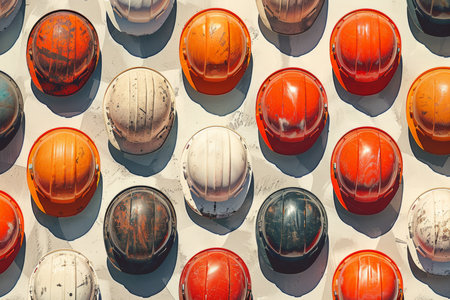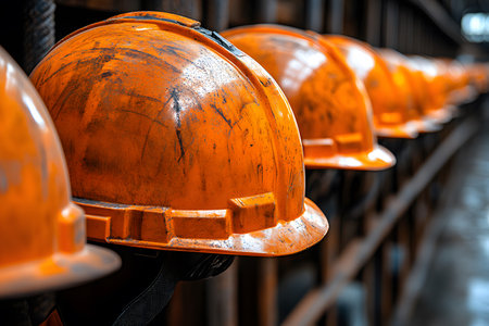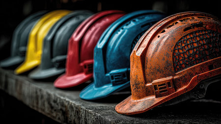 A row of orange hard hats, showing wear and tear, symbolizes the resilience and dedication of construction workers. the focus on texture and detail highlights industrial safety and the labor-intensive environment. Generative AI