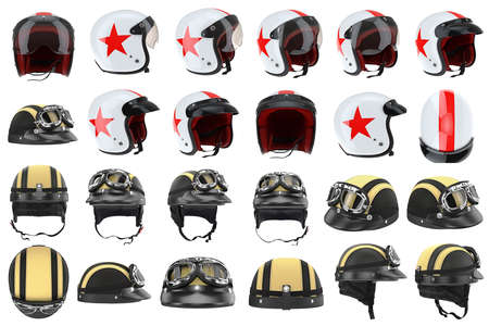 Collection motorcycle helmets protectors for sports. 3D graphic