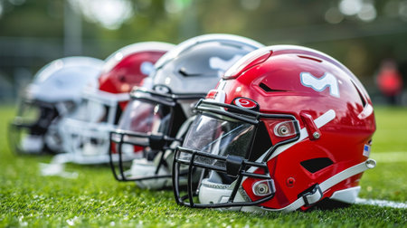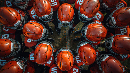 A group of football players wearing helmets and numbered jerseys. Concept of camaraderie and teamwork among the players