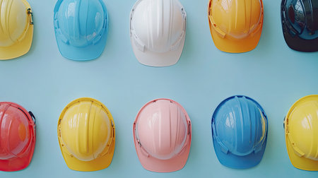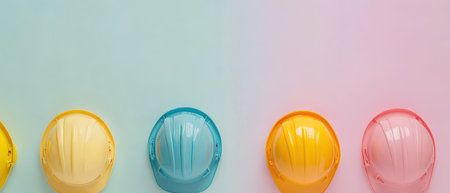 Brightly colored hard hats in yellow blue and pink are neatly lined up against a pastel background creating an eye catching display.