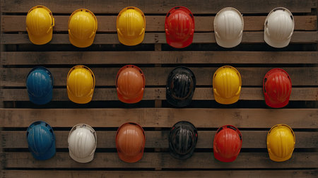 An organized display featuring an array of colorful hard hats hanging on a wooden board, symbolizing safety and readiness in construction environments.