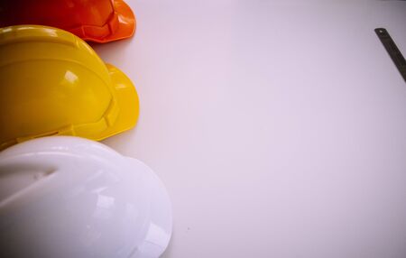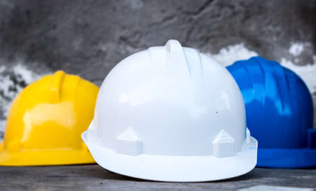 Helmet of construction worker in the construction site. Concept of building.