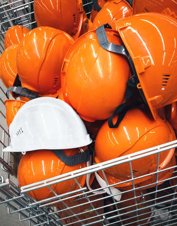 new orange and white industrial helmets close up