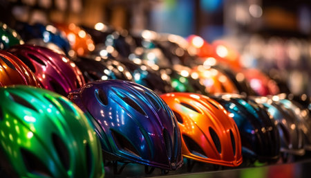 Vibrant colored cycling equipment in a row, illuminated outdoors at night generated by artificial intelligence