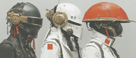 Three futuristic robotic models stand side by side each featuring distinct colors and elaborate headgear. Detailing highlights artistic innovation.