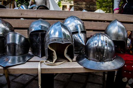 Colourful Variety of Used Helmets Protective Equipment
