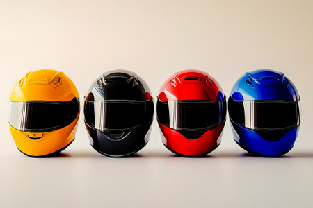 A row of four different colored helmets lined up in a row an white background.