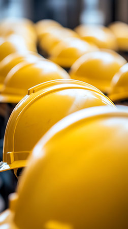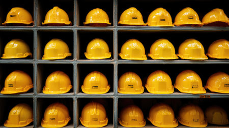 Close-up shows a vibrant arrangement of yellow construction hard hats in neat rows, symbolizing safety and preparation for workers on the job site.