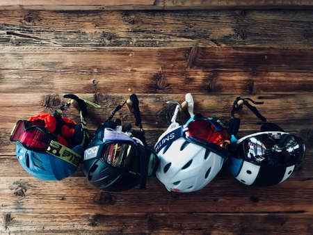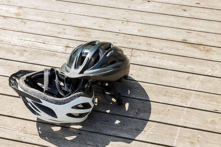 Close up view of two helmets for active sports on wooden background isolated. Sweden.