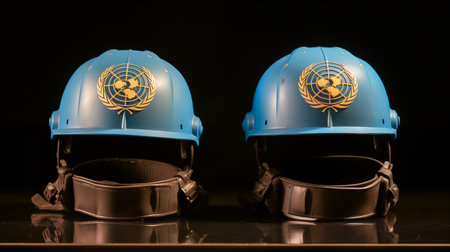 Pair of UN helmets on a black background, conceptual image.