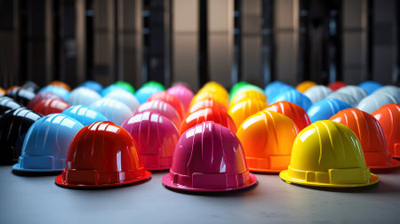 Colorful hardhats on the floor in front of the wall. Generative AI.