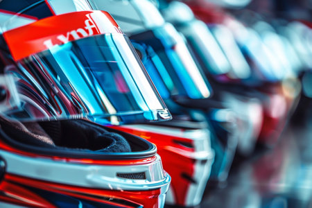 A row of racing helmets with the word Lynx on the front. The helmets are lined up in a row, with some of them being red and white