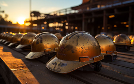 A row of golden hard hats, illuminated by the setting sun, showing the importance of safety in construction work.