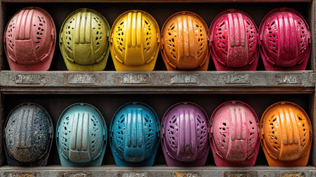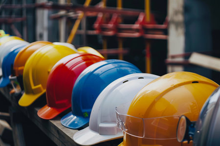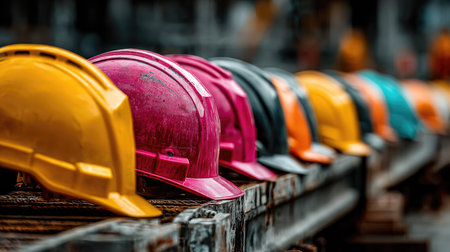 A vibrant array of safety helmets displayed in a row on a construction site, showcasing various colors and styles used for occupational protection and safety.