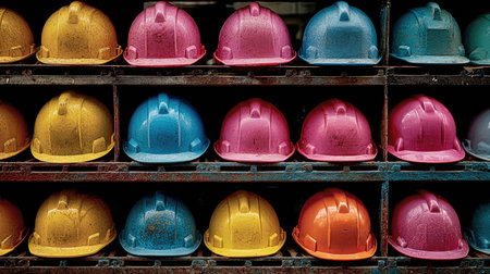 This image showcases an organized array of colorful safety helmets, highlighting various hues that emphasize safety and style in construction.