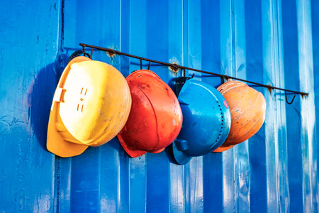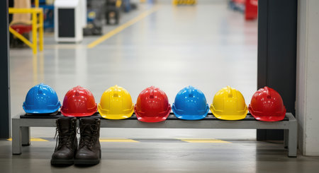 Colorful construction helmets and boots in an industrial setting