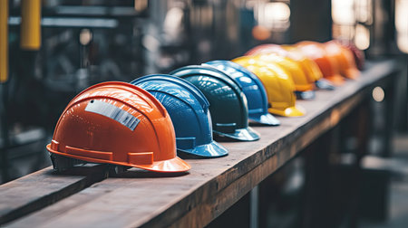 Safety helmets arranged neatly on a wooden bench in an industrial factory setting, highlighting safety protocols.