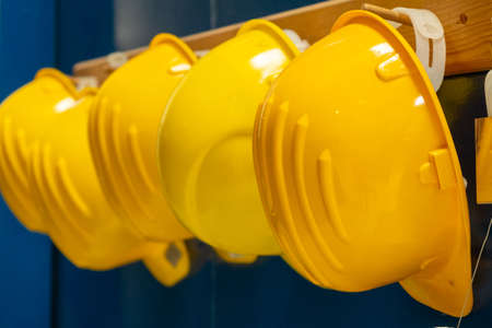 Line of new yellow protective helmets for workers hangs on wooden bar in dressing room of production plant extreme close view