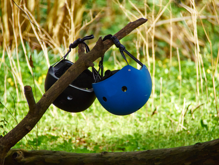 Bicycle mountain bike safety helmets hanged out in nature extrem sports background image