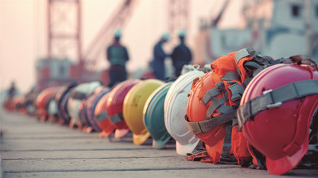 A vibrant array of construction helmets lined up on a dock showcases a commitment to safety, alongside workers preparing for industrial tasks during a beautiful sunset.