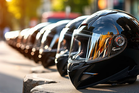 Sleek black motorcycle helmets shine in warm light, creating a stylish look in the retail space.