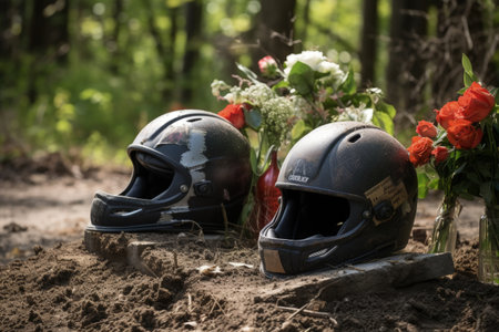Memorial grave site honoring two fallen motorcycle riders with helmets as a remembrance of lost love