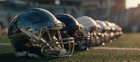 A row of neatly aligned American football helmets with metallic reflections on turf. The stadium is softly focused, creating a cinematic atmosphere with dramatic shadows.