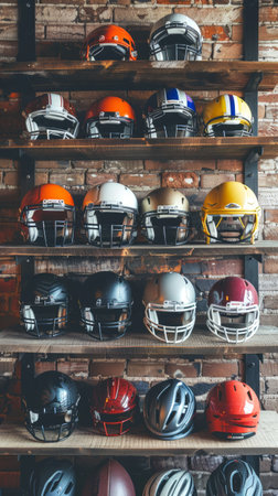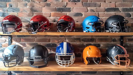 Collection of football helmets and a rugby ball on wooden shelves against a brick wall in a locker room . Concept of sports gear, safety helmets, storage display, athletic equipment.