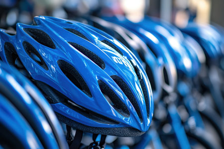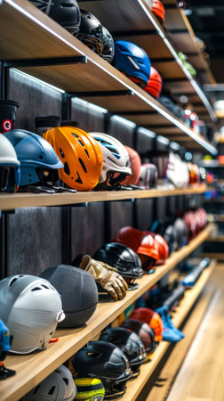 Sports store shelf display of various helmets and protective gear. Concept of sports safety, athlete equipment, outdoor activities, protective headgear. Vertical.