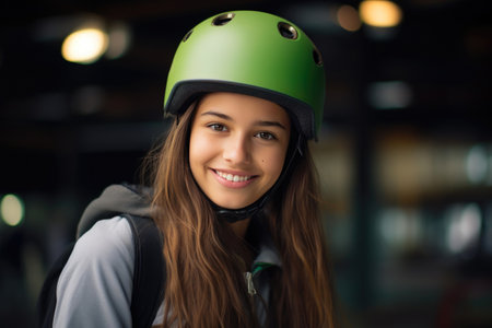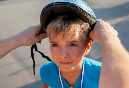 A serious child wearing a helmet prepares for a bike ride, highlighting safety and support. The image emphasizes wellness, protective care, and the joy of outdoor activities.