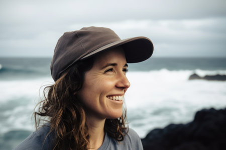 Portrait of a smiling woman wearing a hat looking at the ocean