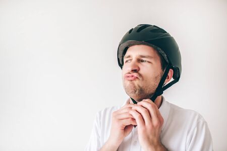 Young man isolated over white background. Serious confident guy closing helmet on his head. Get ready for exercising.