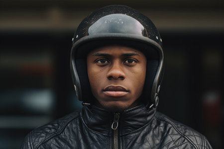 Close-up of the face of a brown-eyed man putting on a motorcycle helmet with his hands.
