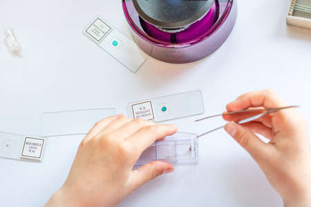 Huelva, Spain - April 28, 2022: Detail of microscope slides in a box for students education