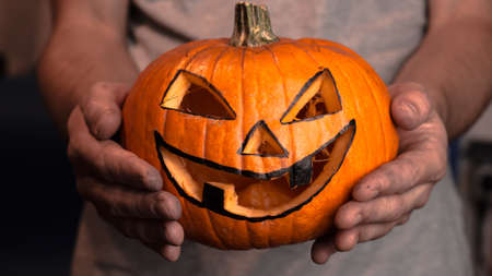 A young man, holds out a halloween pumpkin or jack-o-lantern . The young master made a jack-o-lantern for the Halloween party.