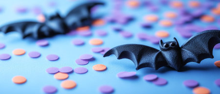 Colorful confetti scattered on a blue background features playful black bats, adding a fun touch to Halloween d
