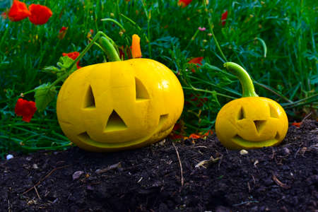 Two yellow pumpkins with carved horns in the garden